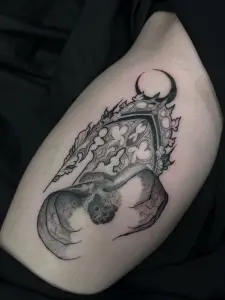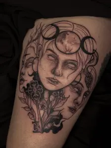 Je travail principalement en semi-réaliste fine line, avec un mélange de black work. Mais je peux également réaliser vos projets fine line, lettrage, floral ou encore ornemental !
