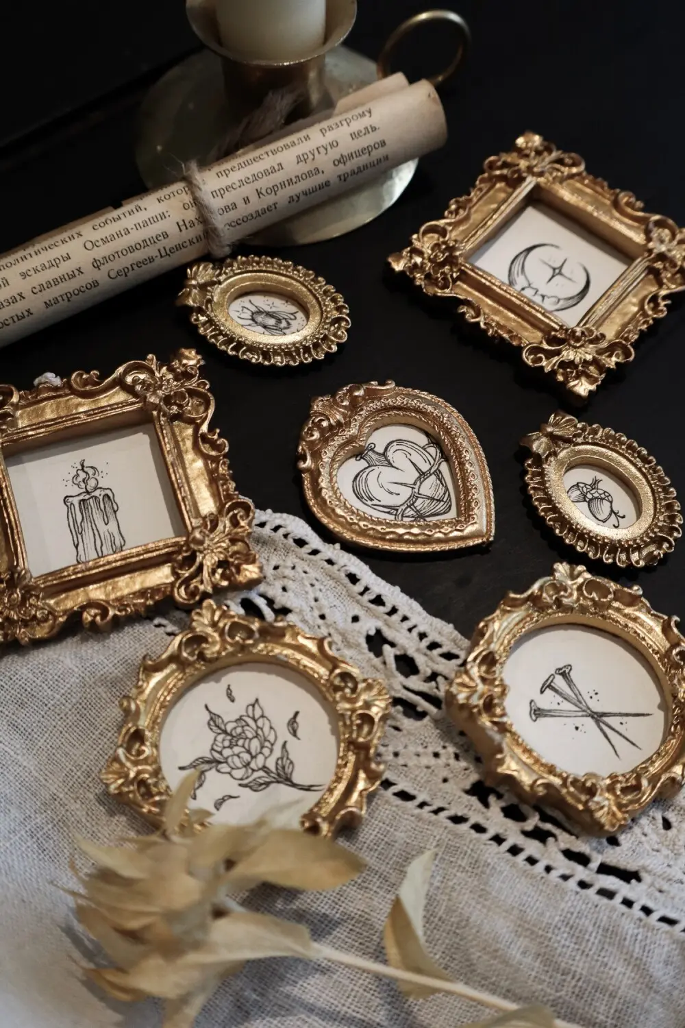 Lot de 7 cadres miniatures avec dessins uniques de 1cm à 2cm réalisés à l’encre. • lune • clous • cœurs épines • fleur • bougie • glands • abeille